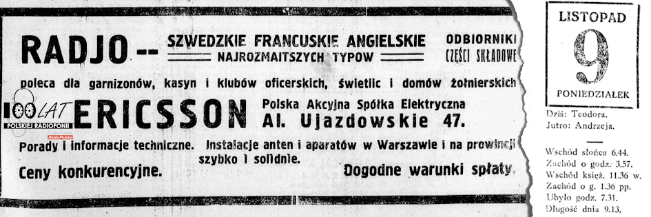 Min. Przemysłu i Handlu dając koncesję nałożyło na spółkę tę obowiązek przejęcia państwowej wytwórni aparatów telegraficznych i telefonicznych na sumę 500 000 zł oraz zorganizowanie specjalnej spółki fabrykacyjnej o kapitale 1 000 000 zł, której wymieniona wytwórnia miała być następnie przekazana. W tej spółce „Polskie Radio” ma obowiązek przejąć 250 000 zł kapitału. Nowe przedsięb. Będzie powołane do życia ze współudziałem jednej z pierwszorzędnych światowych firm technicznych, wyspecjalizowanych w wytwórczości aparatów na prądy słabe i radjoaparatów. Wywiązując się z powyższego zobowiązania Sp. „Polskie Radio” podpisała, za zgodą Min. Przemysłu i Handlu umowę z Polską Sp. Akc. Elektr. „Ericsson”. Spółka ta podnosi swój kapitał do wysokości 1 000 000 zł i odsprzedaje 25% swych akcyj spółce „Polskie Radio”. Poza tem firma Ericsson zobowiązuje się rozwinąć fabrykację w wymienionej państwow. wytwórni aparatów telegraficznych i telefonicznych tak, aby mogła pokryć conajmniej 1/3 wszystkich zapotrzebowań rządowych. Dalej spółka „Ericsson” ma rozwinąć dział radjowy swej fabrykacji w tak szerokim zakresie, aby potrzeba sprowadzania sprzętu radiowego z zagranicy była ograniczona do minimum. Wreszcie spółka „Ericsson” ma obowiązek utworzenia i utrzymywania laboratorjów naukowych, w których prowadzone będą doświadczenia nad udoskonaleniem sprzętu radiowego. Min. Przem. i Handlu zastrzegł sobie prawo jaknajdalej idącej kontroli rozwoju nowej wytwórni. W razie, gdyby rozwój ten według zdania Min. Przem. i Handlu był niedostateczny, będzie miał on prawo stosownie do zawartego układu ustanowić zarząd przymusowy na czas potrzebny do przeprowadzenia w wytwórni niezbędnych reform technicznych. Zauważyć należy, że w roku ubiegłym Min. Przem. i Handlu rozpisało przetarg na sprzedaż państwowej wytwórni aparatów telegraficznych i telefonicznych i że najwyższa cena zaofiarowana na tym przetargu wynosiła około 400 000 złotych. Obecna więc transakcja jest korzystniejsza dla Rządu dzięki osiągnięciu nadwyżki około 100 000 złotych. Pertraktacje prowadzone przez Sp. „Polskie Radio” w sprawie zakupu 2 stacyj nadawczych najnowszego typu zbliżają się obecnie ku końcowi.